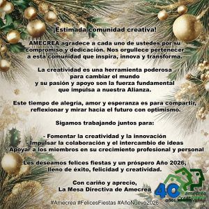 Desde la Mesa Directiva de Amecrea, queremos desearles unas felices fiestas navideñas y un próspero Año Nuevo 2026.